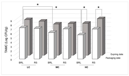 Ready-to-eat leafy green salads’ average total aerobic mesophilic count (TAMC) contamination levels at packaging and expiry date for low-cost (LC), medium-cost (MC) and high-cost (HC) baby romaine lettuce (BRL) and rocket salad (RS) samples (SD < 10%) evaluated using the plate count method. * Significant difference (p < 0.05).