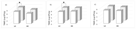 ) for low-cost (LC) and high-cost (HC) samples: (a) baby romaine lettuce (BRL); (b) rocket salad (RS); (c) lamb’s lettuce (LL) samples (SD < 10%) evaluated using the plate count method * Significant difference (p < 0.05).