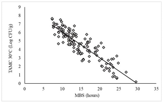 Correlation line between the results obtained with the Micro Biological Survey (MBS) method and reference methods. The total aerobic mesophilic count (TAMC) quantitative results obtained with reference method were plotted against the time taken for the MBS total viable count vials to change color. Continuous line represents the linear regression analysis (slope = 0.30, R2 = 0.79). Each analysis was performed in triplicate (SD < 0.4).