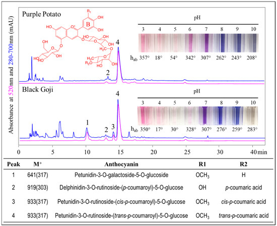 Purple potato and black goji anthocyanin extracts chromatograms at 520 nm and 280–700 nm, and their color expression at different pH.
