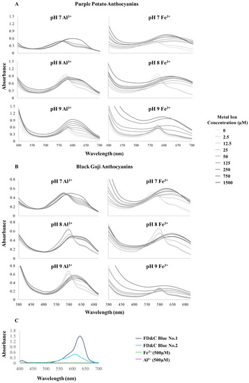 A series of buffer solutions ranging from pH 3 to 10 were prepared (citric acid-Na2HPO4 buffer solutions for pH 3–7; Na2HPO4-NaH2PO4 buffer solution for pH 8; Na2CO3-NaHCO3 buffer solutions for pH 9–10) [28]. Purple potato and black goji anthocyanin extracts (25 μM) were diluted in the above buffers and the final mixtures’ pH environment was confirmed by a pH meter (Mettler Toledo Inc., Columbus, OH, USA). For the metal chelation study, metal ion solutions (Al3+ or Fe3+) were prepared at a concentration of 0.06 M before mixing with 25 μM purple potato or black goji anthocyanin extracts based on specific target anthocyanin to metal ion molar ratios (1:0.1, 1:0.5, 1:1, 1:2, 1:5, 1:10, 1:30, 1:60) in buffers of pH 3–9 (namely, the metal ion concentrations were 2.5, 12.5, 25, 50, 125, 250, 750, and 1500 μM). The final pH condition in each combination was also confirmed by a pH meter. Although the pH differential method is a widely used method for quantifying anthocyanins, the absorbance maximum and molar extinction coefficient for cyanidin 3-O-glucoside are much different than those of the petunidin anthocyanins presented here. Therefore, the “molar ratios” reflect the relative amount of anthocyanins (in cyanindin-3-glucoside equivalents) and metal ions.
