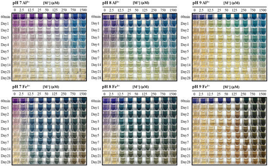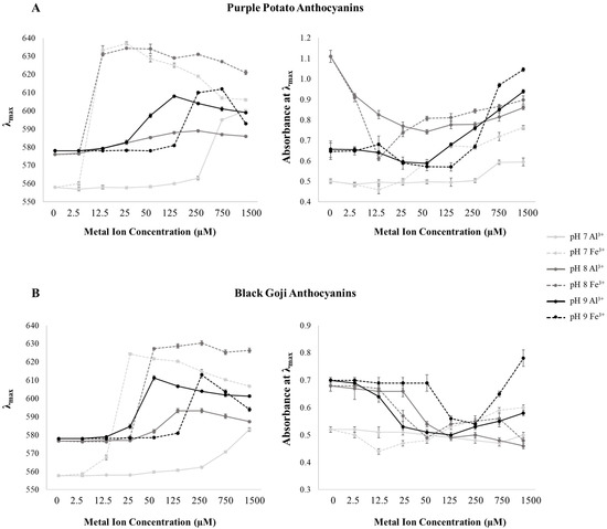 The [M3+] that resulted in maximum λmax and absorbance at each pH level was closely related to the M3+ source. In purple potato extracts, the largest λmax of Pt-Al3+ was accomplished when [Al3+] equaled 1500 μM, 250 μM, and 125 μM at pH 7, 8, and 9, respectively; while it was 25 μM, 50 μM, and 750 μM in Pt-Fe3+ at these same pH levels (Figure 4). Similar trends could be found in black goji extracts (Figure 4). Actually, the [Al3+] that produced the maximum λmax dropped as pH increased, aligning with the idea that M3+ acts in competition with H+ for B-ring attachment in anthocyanins [34]. However, the level of [Fe3+] that produced the largest λmax increased when pH increased, which might be explained by the aggregation and precipitation of anthocyanin pigment triggered by the addition of Fe3+, as well as the poor stability of Fe3+ at an alkaline pH [8,16,18,35].