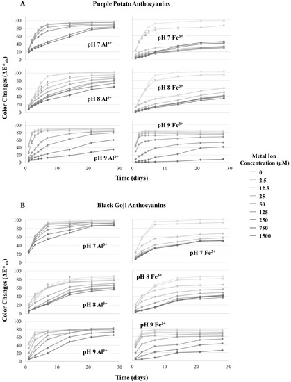 The initial spectrophotometric and colorimetric measurements were collected after 60 min of equilibration. Anthocyanin samples chelated with metal ions were stored in refrigerated (4 °C) conditions in the dark for 4 weeks for the stability test. Experiments were done in triplicate.