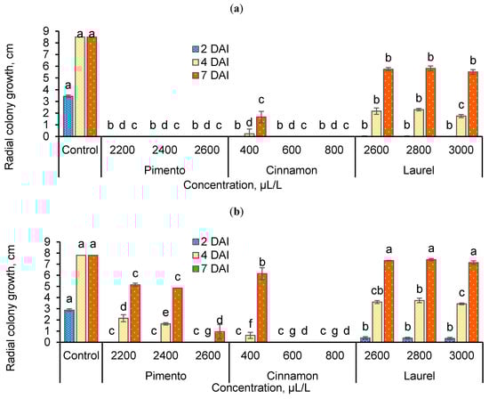 Radial colony growth (cm) on potato dextrose agar medium with different concentrations of extracts for Botrytis cinerea isolated from (a) strawberry and (b) apple. DAI—days after inoculation; the same letters indicate no significant differences between treatments according to Duncan’s multiple range test (p < 0.05) at 2, 4, and 7 DAI.