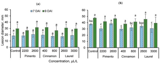 The postharvest antifungal activity of the extracts is shown in Figure 2. Lesions caused by strawberry B. cinerea did not significantly different in the control apples without any extract compared to the apple fruits with applied extracts (Figure 2a) at 7 DAI. Treatment with 2200 µL/L pimento extract and 800 µL/L cinnamon extract resulted in the smallest lesions at 9 DAI. Treatment with 2200 µL/L pimento extract, 400 µL/L and 800 µL/L cinnamon extract, and 3000 µL/L laurel extract significantly reduced lesions caused by apple B. cinerea compared with the control at 7 DAI (Figure 2b). The smallest lesion at 9 DAI was observed on 800 µL/L cinnamon extract-treated apples.