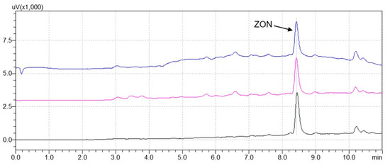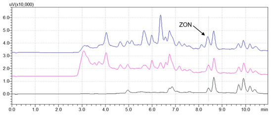 - Hsieh, H.Y.; Shyu, C.L.; Liao, C.W.; Lee, R.J.; Lee, M.R.; Vickroy, T.W.; Chou, C.C. Liquid chromatography incorporating ultraviolet and electrochemical analyses for dual detection of zeranol and zearalenone metabolites in mouldy grains. J. Sci. Food Agric. 2012, 92, 1230–1237. [Google Scholar] [CrossRef] [PubMed]