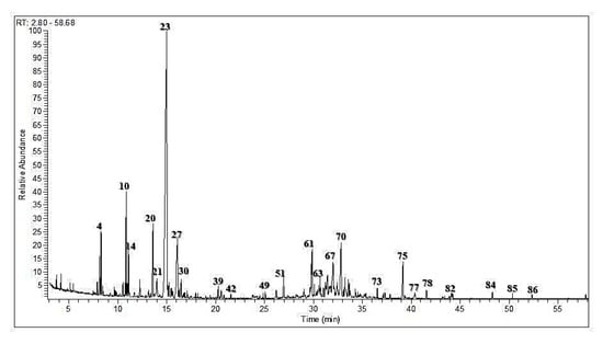 GC 5890 II (Hewlett-Packard GmbH, Homburg, Germany) coupled with quadrupole mass spectrometer (SSQ 7000, Thermo-Finnigan, Bremen, Germany) was used for the identification of the essential oil compounds. Instrumental settings were Gas: 4He (2 mL/min); Temp: T0/45 °C, T2/isothermal, T1/300 °C, T2/isothermal, detector/300 °C, and injector/250 °C, Split ratio: 1:20. Varian 3400 (Varian GmbH, Darmstadt, Germany) was used for GC analyses with OV-5 fused bonded column (Ohio Valley, OH, USA) and a Flame Ionization Detector (FID) for quantitative determination of the components. Mean of 3 independent runs was used to calculate areas under the peaks (AUP) using an SRI Instrument (Torrance, CA, USA) and the total area was considered as 100%. Wiley Registry of Mass Spectral Data 8th edition, National Institute of Standards and Technology (NIST) Mass Spectral Library (December 2005), and the literature were used to compare and identify the active constituent of spectral data [29,30].