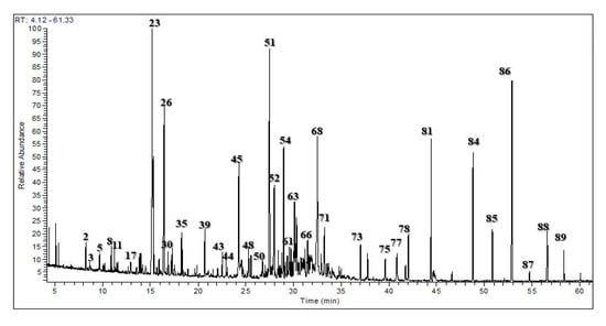- Thabet, A.A.; Youssef, F.S.; El-Shazly, M.; Singab, A.N.B. GC-MS and GC-FID analyses of the volatile constituents of Brachychiton rupestris and Brachychiton discolor, their biological activities and their differentiation using multivariate data analysis. Nat. Prod. Res. 2018, 34, 590–594. [Google Scholar] [CrossRef]