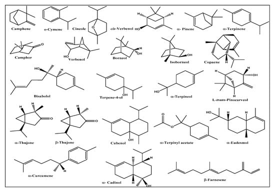 The chemical compositions of C. indicum and C. morifolium essential oils have been previously studied. Camphor, borneol, camphene, α-pinene, p-cymene and 1,8 cineole are the major constituents of the oils [27,28]. In spite of the significant biological importance of these plants, their essential oils were not fully investigated, only the antimicrobial activity had been studied [28].