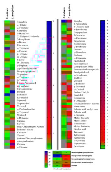 A heatmap comparison based on abundance of individual component of C. indicum and C. morifolium; gray color indicated non-detectable levels of identified component.