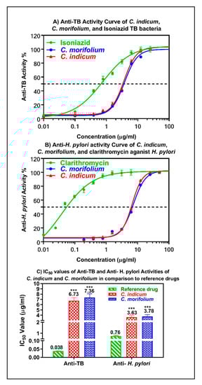Additionally, both oils showed a substantial anti-mycobacterial activity against M. tuberculosis with IC50 values of 6.73 and 7.36 µg/mL for C. indicum and C. morifolium, respectively, albeit lower than the positive control isoniazid (IC50 = 0.038 µg/mL). Nothing was previously reported in literature about the anti-mycobacterial and anti-Helicobacter pylori of the oils. Furthermore, both oils exhibited a good activity against Helicobacter pylori with IC50 values of 3.63 and 3.78 µg/mL for C. indicum and C. morifolium, respectively approaching that of clarithromycin (Figure 6). These results represent very good candidates for further studies taking into consideration that very limited work was done on the anti-Helicobacter pylori (only MICs were calculated and no IC50 could be found) [55,56]. The observed anti-mycobacterial and anti-Helicobacter pylori potential of the essential oils is mainly attributed to the presence of terpenes and fatty acids that account for the lipophilicity and greater penetration through the cell membrane triggering a massive disturbance in the oxidative phosphorylation and the electron transport chain as well resulting in a serious interference in the production of energy with concomitant evolution of auto-oxidation and peroxidation degradation compounds and bacterial lysis [35,57].