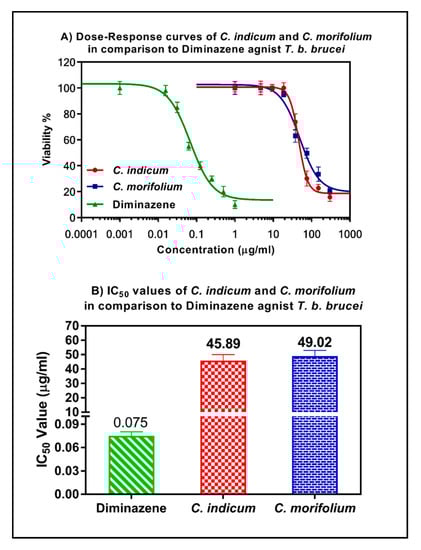 Both essential oils showed a moderate anti-trypanosomal activity with IC50 values of 49.02 and 45.89 μg/mL, albeit lower than diminazene (positive control; IC50 = 0.075 μg/mL) (Figure 7). The selectivity indexes of the two oils were calculated as 1.8 and 1.5, respectively, indicating low selectivity against trypanosomes compared to their cytotoxicity versus HL-60 cells (88.24 and 68.84 μg/mL, respectively). It is worthy to highlight that nothing was traced in literature regarding the assessment of the anti-trypanosomal potency of both essential oils. However, it was noticed that both methanol and chloroform extracts of the same plants showed higher potency against T. brucei. C. indicum showed IC50s of 16 and 15.3 μg/mL for chloroform and methanol extracts, respectively [44]. In addition, this activity is better than our previously tested Citrus oils which exhibited lower activity with IC50 value = 60–72 μg/mL [33,58]. The activity of both oils is caused by their lipophilic terpenes which effectively interact with membrane lipids and proteins causing membrane disruption and ultimate cell death [59].