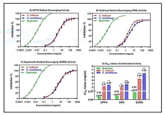 Antioxidant activities of the essential oils obtained from C. indicum and C. morifolium flower heads versus quercetin as a reference drug in DPPH (A), hydroxyl radical scavenging (HRS) (B), and superoxide radical scavenging (SORS) (C) assays. The means with different stars are significantly different (p < 0.05).