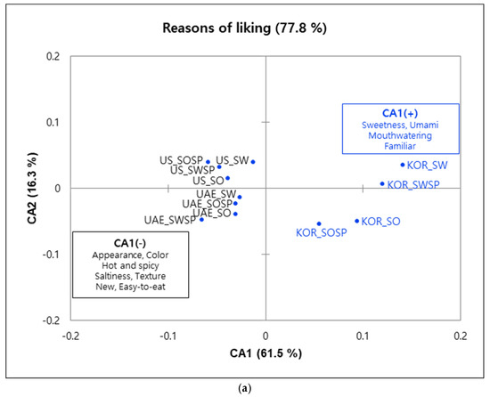 Figure 4 shows the first two component plots of CA carried out on the spicy dipping sauce samples. In the reasons for liking, CA1 (61.5%) differentiated the KOR consumers (positive CA1) from the UAE and US consumers (negative CA1). Subsequently, CA 2 contrasted sweet samples (positive direction) vs. sour samples (negative direction) for Korean consumers and additionally contrasted samples evaluated by US vs. UAE consumers, irrespective of the type of samples. Appearance (KOR 33.1%, UAE 42.2%, US 64.6%) and color (KOR 31.9%, UAE 71.7%, US 72.1%) were frequently selected by US and UAE consumers as reasons for liking and showed a strong positive correlation, and were thus loaded on the negative CA1. KOR consumers tended to choose sweet, umami, familiar, and mouthwatering descriptors more frequently than other consumers to describe the liking for the dipping sauce samples. Conversely, hot and spicy, saltiness, new, and easy-to-eat were favorably selected terms among UAE and US consumers. Koreans specifically liked sweet tasting samples because of their sweetness (45.0%), umami (35.0%), familiar (30.0%), mouthwatering (29.4%) while familiar was the only main reason they liked sour samples.