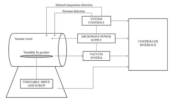 Fresh broccoli florets, Navel oranges, and carrots were bought from a local market and stored in refrigeration before pretreatment. For air-drying of the samples in this study, the Harvest Saver Tray Dryer Commercial Dehydrator Systems, Inc. (CDS, Eugene, OR, USA) was used for all samples. In the freeze-drying process, the Labconco FreeZone 6L freeze drier (Kansas City, MO, USA) was used for all the samples. Also, the REV drying process for all samples in this study was done in the vacuum-microwave drying machine uniquely designed by EnWave Corporation (Vancouver, BC, Canada) with the maximum power level to be 2 kW. A schematic diagram of this equipment is shown in Figure 1. The system consisted of a vessel with a turntable where the product was kept and vessel door was shut. The microwave power and vacuum level in the vessel were switched on and controlled by a controller interface.