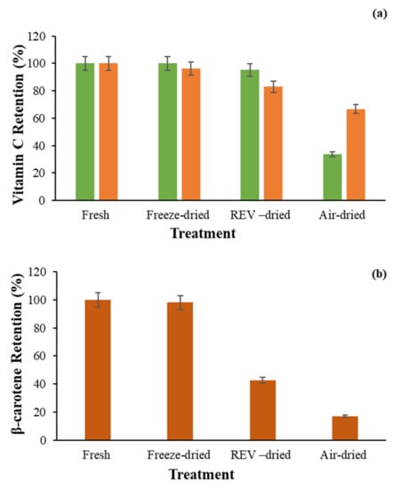 (a) Retention of Vitamin C in broccoli (▪) and oranges (▪); (b) Retention of β-carotene in carrot; Radiant Energy Vacuum dried (REV-dried).