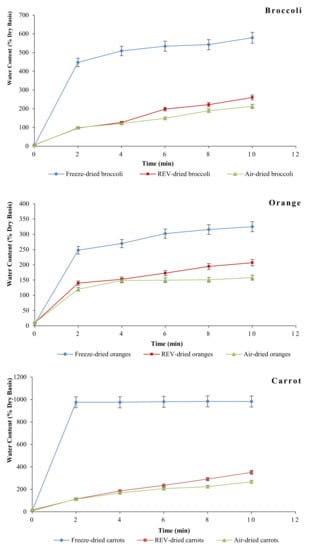The rehydration properties of dehydrated products of all three treatments are exhibited as changes in the water content (dry base) over the 10-min rehydration test in a 30 ℃ water bath. The details are shown in Figure 3 below. As could be seen from the graphs, the freeze-dried products had the highest potential of rehydration, while the air-dried ones had the lowest. Also, at the beginning of the rehydration, there was a higher rate for all the products; however, it was more evident in freeze-dried products. These results agree with other studies and may be attributed to the highly porous and less dense structure caused by freeze-drying treatment [14,29]. Moreover, by comparing REV- and air-dried products’ rehydration curve, it can be seen that REV-dried products have significantly higher rehydration capacity (p 0.05), and the reason for this is the more open and spongy structure in REV products as a result of vapor expansion during internal water vaporization in the REV process [30].