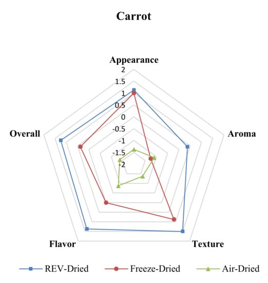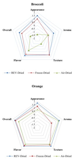 The sensory evaluation results of REV-dried, freeze-dried, and air-dried products are shown in Figure 4 below. The mean scores of sensory attributes, including appearance, aroma, texture, flavor, and overall acceptability are shown on a scale of −2 to 2 for all the types of dried products on a cobweb plot. The REV-dried products scored the highest in all the sensory attributes except for the texture in broccoli; also, the air-dried ones received the lowest except aroma. The freeze-dried products gained positive scores from the panelists for all the attributes except the aroma, and this may be attributed to the significant loss of volatiles during the freeze-drying process [14]. The visual differences between these dried products with three different drying methods is shown in Figure 4 and it is clear that the air-dried products experienced a significant change in appearance and color. Furthermore, heat treatment in REV- and air-drying processes can enhance the aroma of the products [31]. The sensory evaluation test indicated that the REV-drying led to a better taste and optical property compared to freeze-drying and air-drying, and this result is in agreement with previous studies [30,31]. The broccoli, orange, and carrot immediately after REV-drying is shown in Figure 5.