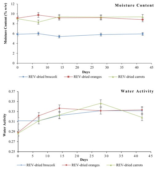 The moisture content and water activity of the REV-dried broccoli, orange, and carrot were tested on days 0, 7, 14, 28, and 42 after starting the experiment. The trend of changes is shown in Figure 6. As seen from the graphs, the moisture content and water activity of the REV-dried products stayed stable over the accelerated shelf life with no significant variation. This indicates that the products were properly sealed and stored, no extra moisture invaded into the package.