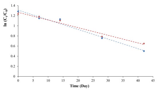 where = reaction time, day; = rate constant, s−1; = concentration at time t; = initial concentration.