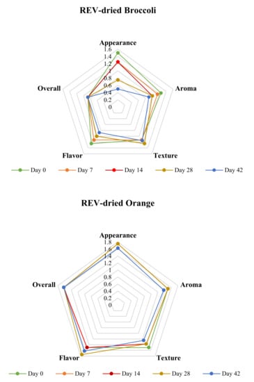 For REV-dried oranges, the scores almost did not change during the 42-day shelf life, and all stayed at a high level. This means that the sensory properties are well retained in oranges even if at elevated storage temperature and the oranges’ acidic nature may account for that [35].