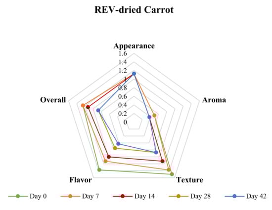 As could be seen from the Figure, with the increase of storage time, the overall score for REV-dried carrots experienced a slow downward trend. This could be associated with color loss because of oxidation of highly unsaturated molecules, and the degradation of β-carotene, which can lead to the development of an off-flavor in dehydrated carrots [38]. However, all the attributes still obtained positive feedback from the panelists, which proved the acceptability of the products.