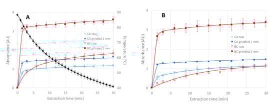 | Plant Nature and Granulometry | Extraction Mode | Extraction Time to Get 70% of the Abs at 30 min (min) | Absorbance at 30 min | 10 min Extraction Time | 30 min Extraction Time | ||||||