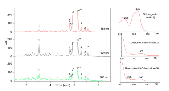 | 1 | 3.24 | 219, 238, 325 | 353 | 191, 179 | Phenolic acid (Hydroxycinnamic acid) | Chlorogenic acid |