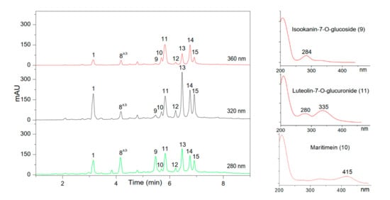 | 11 | 5.83 | 280, 335 | 461 | 285 | Flavonoid (Flavone) | Luteolin-7-O-glucuronide |