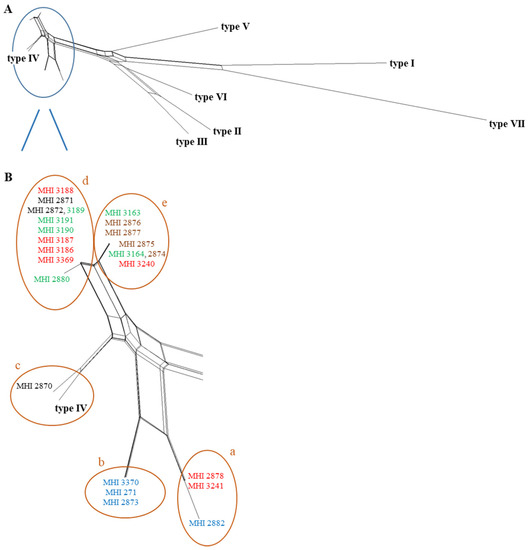 - Huson, D.H.; Bryant, D. Application of phylogenetic networks in evolutionary studies. Mol. Biol. Evol. 2006, 23, 254–267. [Google Scholar] [CrossRef]