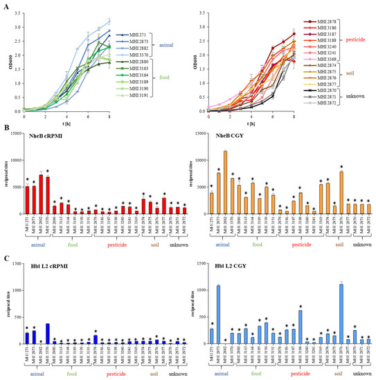 - Jessberger, N.; Krey, V.M.; Rademacher, C.; Böhm, M.E.; Mohr, A.K.; Ehling-Schulz, M.; Scherer, S.; Märtlbauer, E. From genome to toxicity: A combinatory approach highlights the complexity of enterotoxin production in Bacillus cereus. Front. Microbiol. 2015, 6, 560. [Google Scholar] [CrossRef]