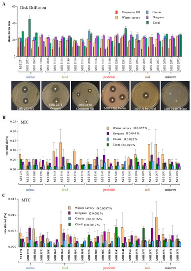 3.5. Growth Inhibition by Essential Oils (EOs)