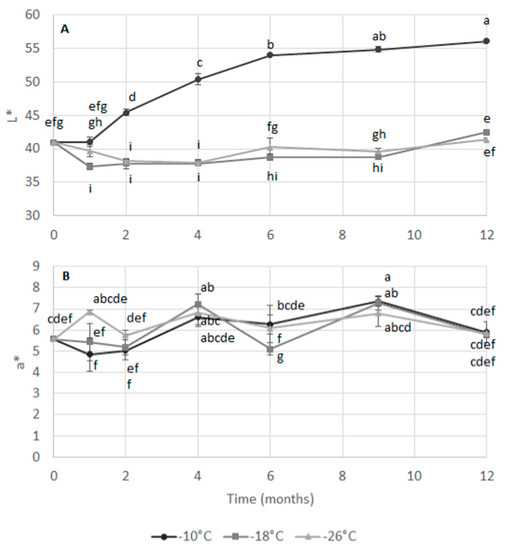 Evolution of color during storage can be associated with structural changes [23], as well as variations in pigments concentrations and their oxidative status [24]. While at the temperatures of −18 °C and −26 °C the L* values were roughly constant (37–42) throughout the 12-months storage, the sample stored at −10 °C showed a significant increase during the entire storage period, reaching values of 56. This parameter was significantly influenced by storage temperature, time and their interaction (Table 2). By contrast, the red index was significantly affected only by storage time and by the interaction between time and temperature. Although some significant variations were observed among samples during storage, there was not a clear trend and values remained between 5 and 7.