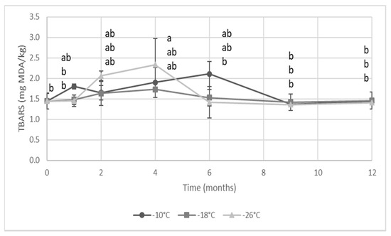 Thiobarbituric acid reactive substances (TBAR) values of mechanically separated mantis shrimp flesh during frozen storage at −10, −18 and −26 °C. Different letters indicate significant differences (at p < 0.05) among samples.