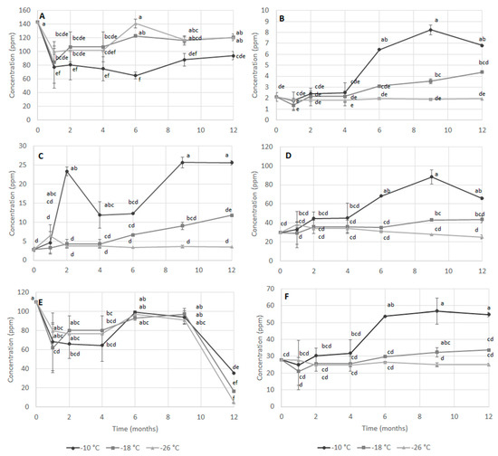 Concentration (ppm) of trimethylamine-O (TMA-O) (A), trimethylamine (TMA) (B), dimethylamine (DMA) (C), lysine (D), sarcosine (E) and alanine (F) measured by 1HR-NMR in extracts of mantis shrimp mechanically separated flesh during frozen storage at −10, −18 and −26 °C. Different letters indicate significant differences (at p < 0.05) among samples.