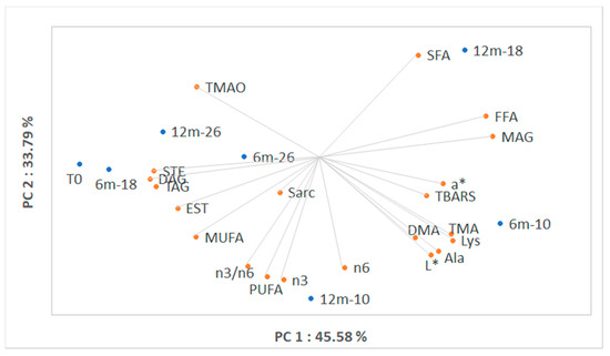 Scores and loadings biplot of data obtained from samples at the beginning of the storage (0), after 6 months (6 m) and 12 months (12 m) of storage at −10, −18 and −26 °C. PC, Principal Component; a*, red index; Ala, alanine; DAG, diacylglycerols; Dimethylamine, DMA; EST, esterified sterols; FFA, free fatty acids; L*, luminosity; Lys, lysine; MAG, monoacylglycerols; MUFA, monounsaturated fatty acids; PUFA, polyunsaturated fatty acids; Sar, sarcosine; SFA, saturated fatty acids; TAG, triacylglycerols; STE, sterols; TBARs, thiobarbituric acid reactive substances; TMA, trimethylamine-N; TMA-O, trimethylamine-O.