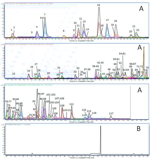 MRM condensed chromatogram at LOQ value of the 116 pesticides analyzed in the present study (A), and blank matrix (B).
