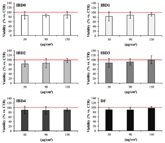 Intestinal 70% Caco-2/30% HT-29 co-culture viability after incubation with IBDs. The graphs in the figure represent the viability of intestinal co-culture cells after incubation with 50, 90, and 150 µg/cm2 of IBD0, IBD1, IBD2, IBD3, IBD4, and DF. The viability results are expressed as % vs. CTR (100), represented by the red line. Each % comes from the average of three independent experiments, each with at least two replicates.