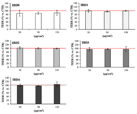 Intestinal 70% Caco-2/30% HT-29 co-culture TEER after incubation with IBDs. The graphs in the figure represent the monolayer integrity of intestinal co-culture cells after the incubation with 50, 90, and 150 µg/cm2 of IBD0, IBD1, IBD2, IBD3, and IBD4. The viability is expressed as % vs. CTR (100), represented as a red line. Each % comes from the average of two independent experiments, each with at least two replicates.