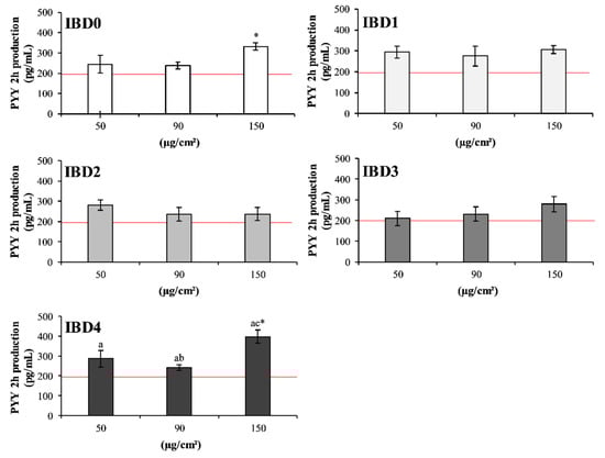 Differential secretion of PYY by intestinal co-culture after incubation with IBDs. The graphs in the figure represent the PYY production (pg/mL) of intestinal co-culture cells after 2 h incubation with 50, 90, and 150 µg/cm2 of IBD0, IBD1, IBD2, IBD3, and IBD4. Asterisks highlight statistically significant difference vs. CTR cells (red line, p < 0.05), while letters vs. different concentrations of the same IBD (p < 0.05). Each value comes from one independent experiment with two replicates.