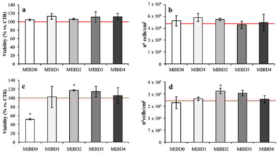 Viability and number of living human Saos-2 osteoblast-like cells after incubation with MIBDs. Viability and number of living cells were evaluated after three (a,b) and seven (c,d) days of cell incubation with 150 µg/cm2 of each MIBDs. Each bar represents the mean from three independent experiments, each with at least two replicates. Asterisks indicate statistical differences (p < 0.05) compared to CTR cells, indicated in the graph as a red line.