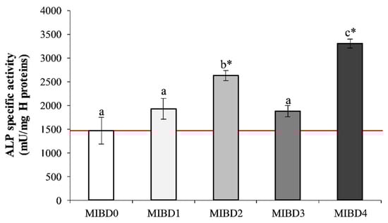 ALP activity of human Saos-2 osteoblast-like cells after incubation with in vitro MIBDs. ALP activity was measured after seven days’ incubation with 150 µg/cm2 MIBDs. Each bar represents the mean from two independent experiments. Asterisks indicate statistical differences (p < 0.05) from CTR cells, indicated in the graph as a red line, while different letters highlight significant differences among MIBDs.