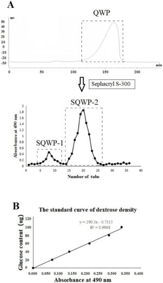 (A) Elution curve of the water-extractable (SQWP-2) on a Sepharose Flast Flow column and gel filtration chromatography; (B) standard curve of dextrose density.