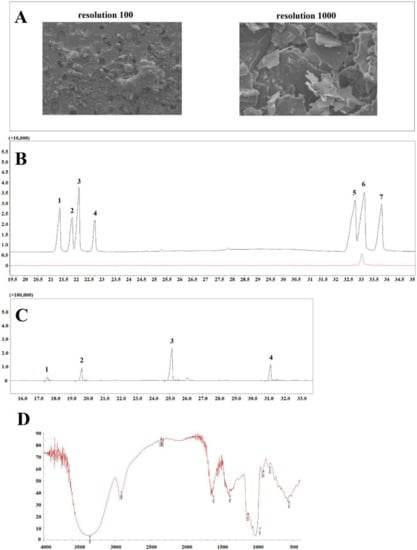 (A) Scanning electron microscopy (A × 100, B × 1000); (B) monosaccharide composition analysis by chromatograph-mass spectrometry (GC-MS). (1). Rham, (2). Fuc, (3). Ara, (4). Xyl, (5). Man, (6). Glu, (7). Gal; (C) Glycosidic linkage by methylation analysis. (1). 1,3,4,6-Me4-Glc/Manp, (2). 2,3,4,6-Me4-Glcp, (3). 2,3,6-Me3-Glcp, (4). 2,3-Me2-Glcp; (D) FT-IR spectra of SQWP-2.