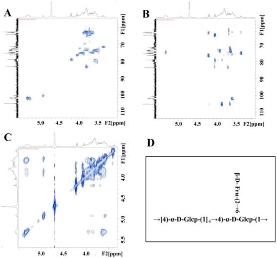 Glycoside linkage signals of polysaccharides were assigned from HMBC according to the 1D-2D NMR spectra. The δ 101.14 of the →4)-α-Glcp-(1→ glycoside linkage exhibited a signal peak corresponding with its H4 δ3.55, evidencing the existence of a →4)-α-D-Glcp-(1→4)-α-D-Glcp-(1→ linkage. The terminal α-D-Glcp-(1→ and Fru-(2→ group was found to be bonded to the main chain by O-6. The structural formula of SQWP-2 was shown in Figure 3G.