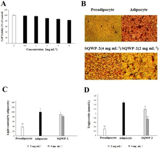 MTT cell viability of SQWP-2. Data are shown as mean ± SD. * p < 0.05 vs. control; ** p < 0.005 vs. control. (A) Effect of SQWP-2 on intracellular lipid accumulation in 3T3-L1 cells. Cells were treated with SQWP-2 (2 mg mL−1 and 4 mg mL−1) for day 8; (B) The mature adipocytes were colored with oil-red O; (C) OD value (% adipocyte); (D) TG content (mmol L−1) were measured to quantify intracellular lipid content.