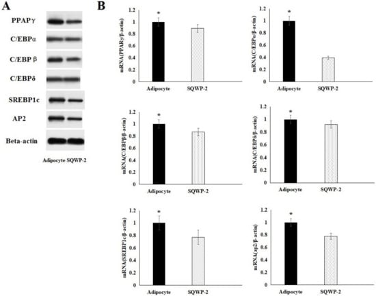 Effect of SQWP-2 on the protein levels (A) and mRNA expression (B) of related pathways in 3T3-L1 cells. Experiments were performed three times, and data are shown as mean ± SD. Values that do not share the same letter are significantly different (* p < 0.05).