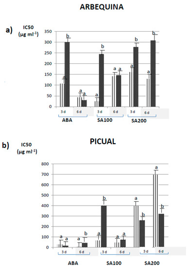 Free radical scavenging radical activity (expressed as IC50) of olive fruits control (indicated as striped columns) and treated (indicated as black columns) with ABA, SA100 and SA200 on days 3 and 6 after treatment. Data on Arbequina (a) and Picual (b) cultivars are included. The values were estimated as means ± Standard Deviation (n = 3). Different letters indicate significant (p < 0.05) differences between control and treated samples.