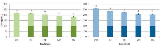 Doses of bentonite required for protein stabilization of wines in different treatments of Experiment 1 determined by heating stability test (green bars) and heating with tannins test (blue bars), respectively [14]. CO—control wine without bentonite in fermentation, JU—initial granular sodium-activated bentonite dose added into clear juice, BE—initial granular sodium-activated bentonite dose added at the beginning of fermentation, MD—initial granular sodium-activated bentonite dose added in the middle of fermentation, EN—initial granular sodium-activated bentonite dose added near the end of fermentation. The wines were treated by additional granular sodium-activated bentonite doses after fermentation to achieve total protein stability. Dark color segments of the bars represent initial doses, and light color segments represent additional doses. Different lowercase letters above bars represent statistically significant differences among treatments with respect to total bentonite dose required, at p < 0.05 obtained by one-way analysis of variance (ANOVA) and Fischer’s least significant difference (LSD) test.