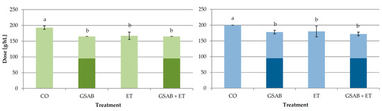 The doses of GSAB (initial, additional, and total) applied during fermentation with or without ET in order to achieve protein stable Malvazija istarska wines are shown in Figure 3. As in Experiment 1, GSAB treatment (addition of bentonite near the end of fermentation) significantly reduced the total dose required in relation to control CO wine. Interestingly, ET treatment reduced the total dose to the same extent. Although GSAB + ET treatment reduced the total dose needed, the effects of GSAB and ET did not add up when combined.